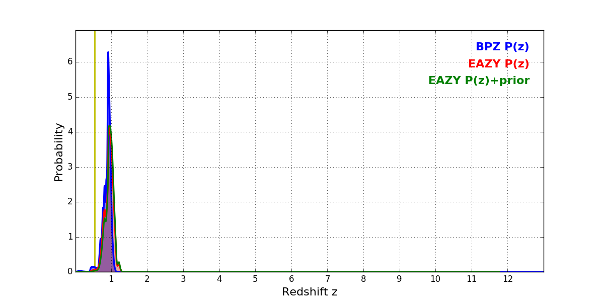 In P(z) plots: Yellow lines mark the cluster redshift z = 0.546,
