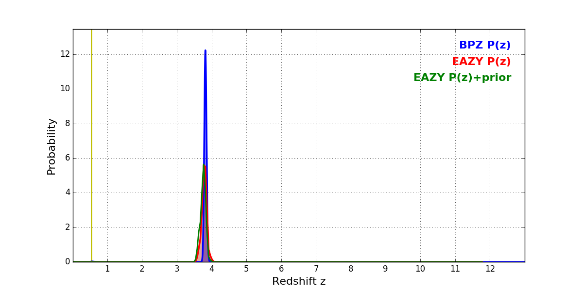 In P(z) plots: Yellow lines mark the cluster redshift z = 0.546,
