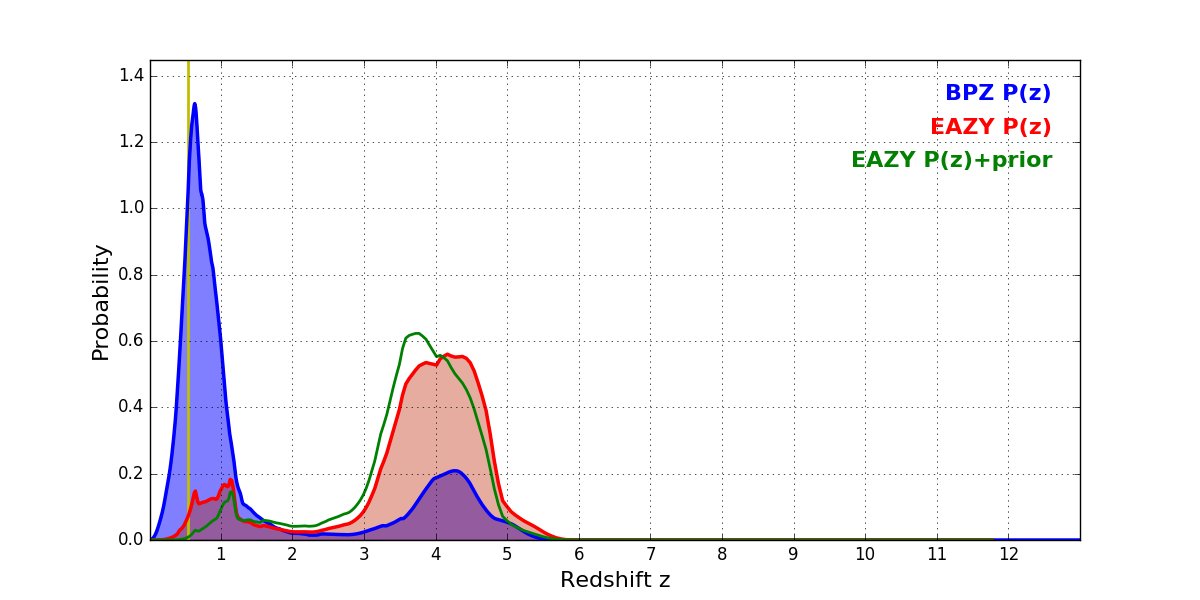 In P(z) plots: Yellow lines mark the cluster redshift z = 0.546,