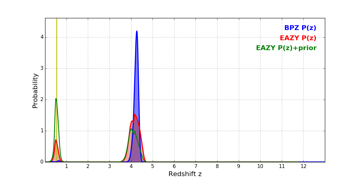 In P(z) plots: Yellow lines mark the cluster redshift z = 0.546,