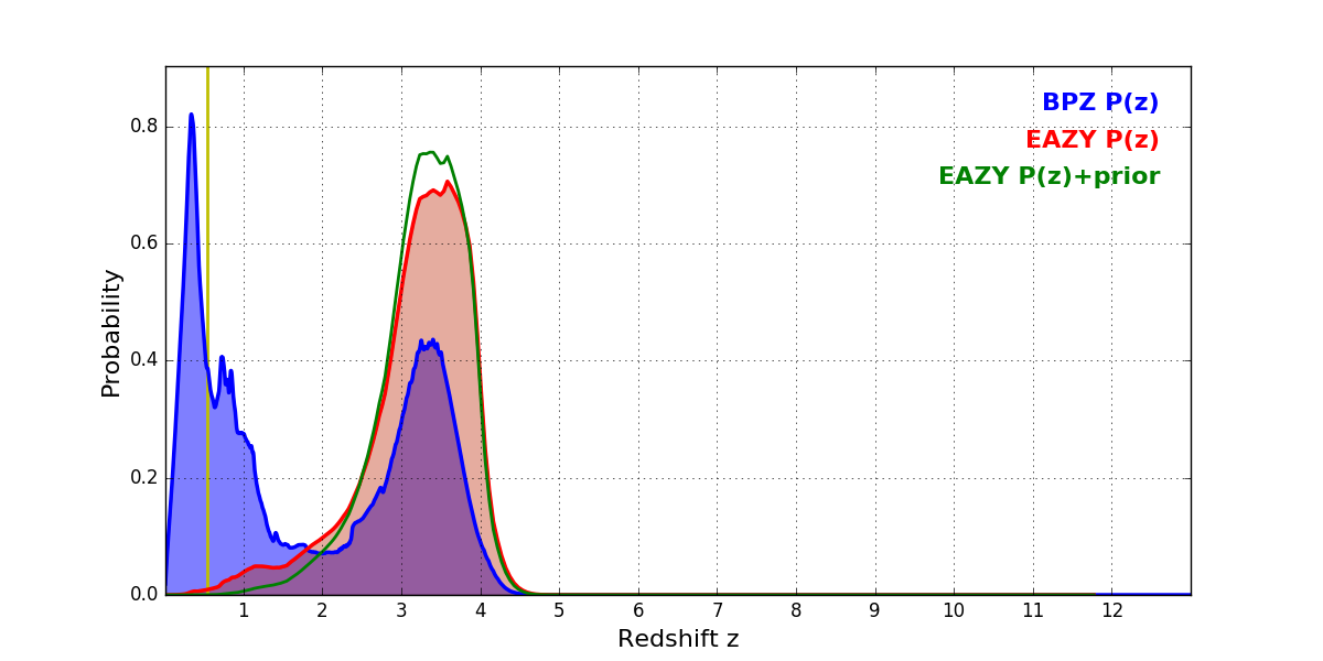 In P(z) plots: Yellow lines mark the cluster redshift z = 0.546,