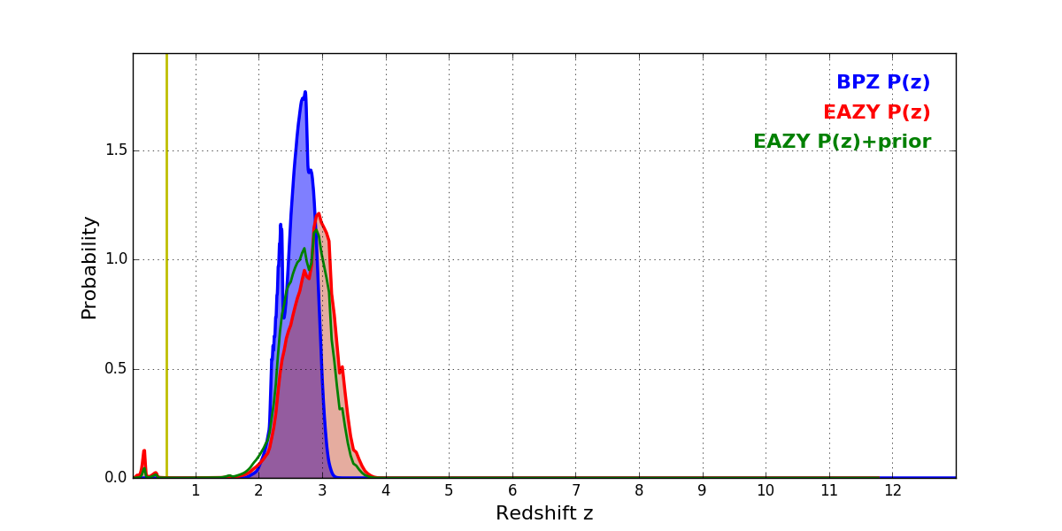 In P(z) plots: Yellow lines mark the cluster redshift z = 0.546,