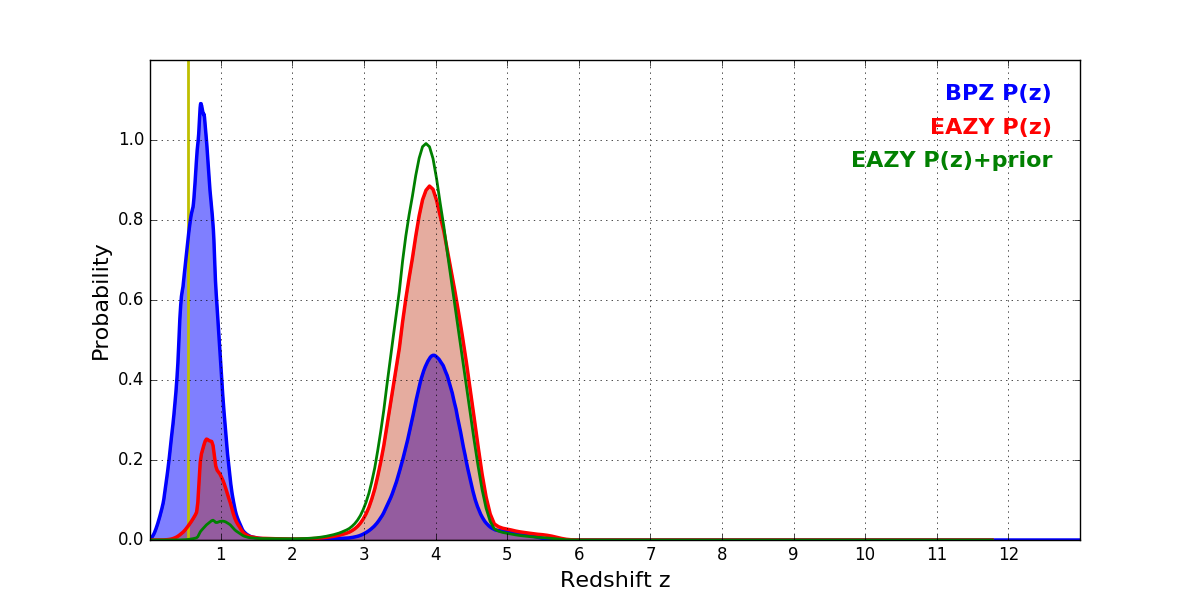 In P(z) plots: Yellow lines mark the cluster redshift z = 0.546,