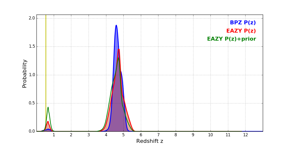 In P(z) plots: Yellow lines mark the cluster redshift z = 0.546,