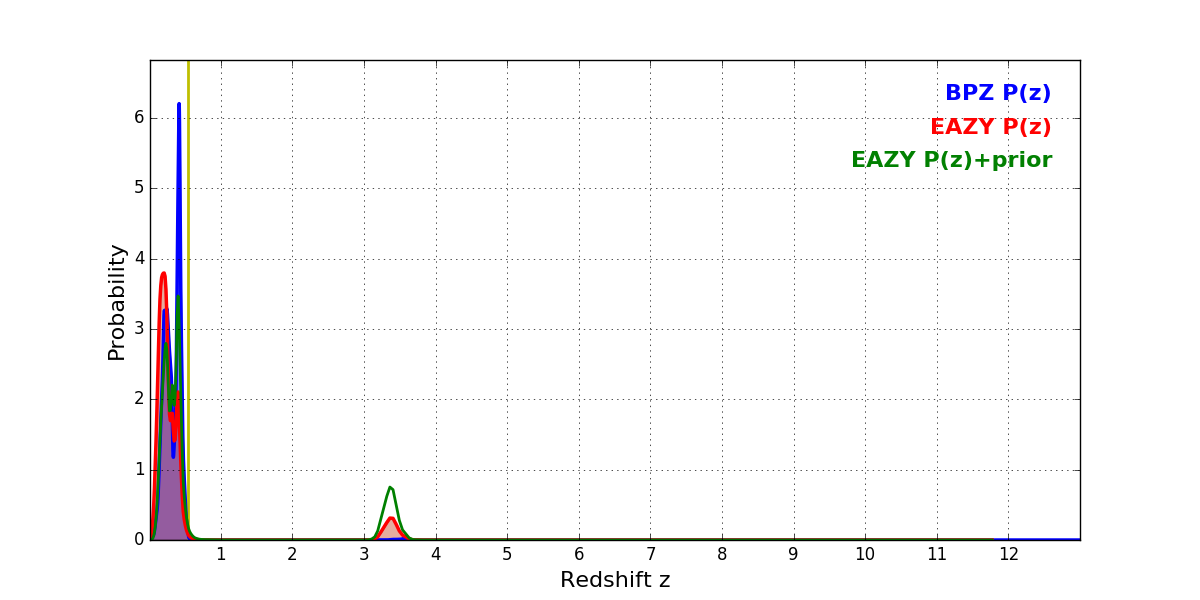 In P(z) plots: Yellow lines mark the cluster redshift z = 0.546,