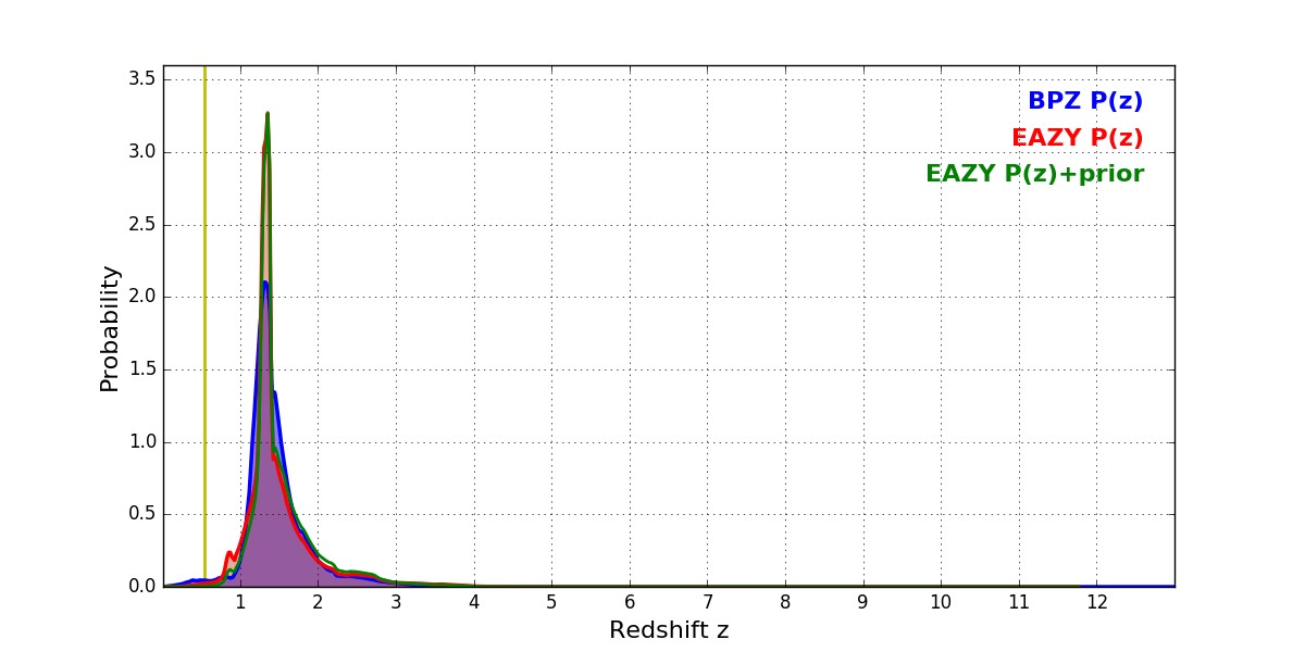 In P(z) plots: Yellow lines mark the cluster redshift z = 0.546,