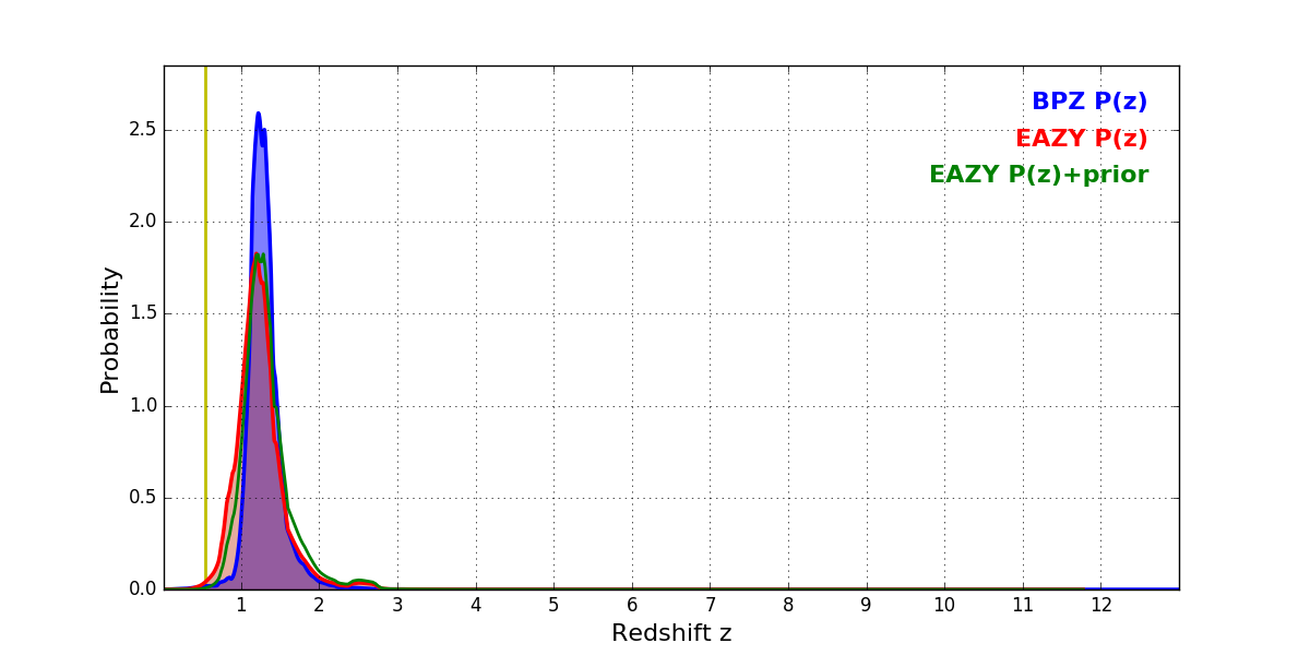 In P(z) plots: Yellow lines mark the cluster redshift z = 0.546,