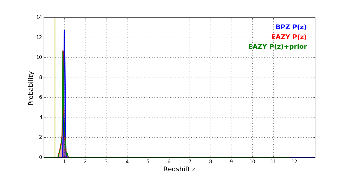 In P(z) plots: Yellow lines mark the cluster redshift z = 0.546,