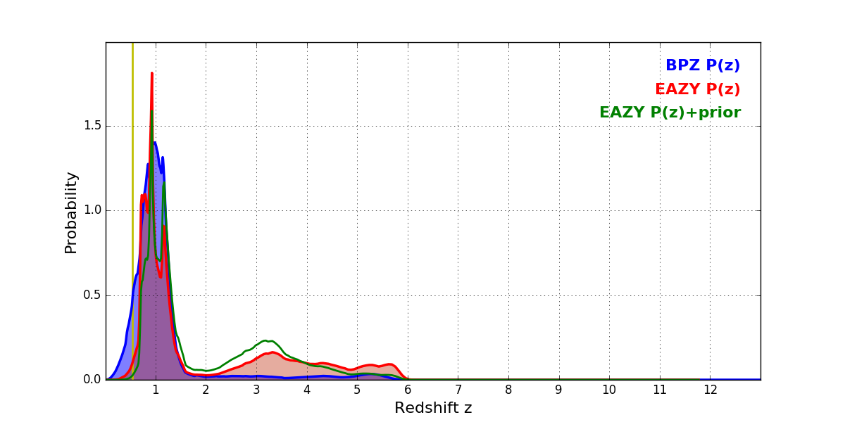 In P(z) plots: Yellow lines mark the cluster redshift z = 0.546,