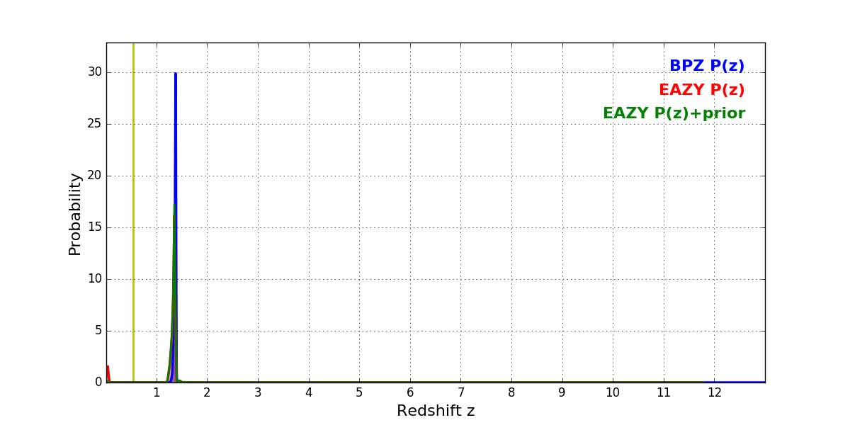 In P(z) plots: Yellow lines mark the cluster redshift z = 0.546,