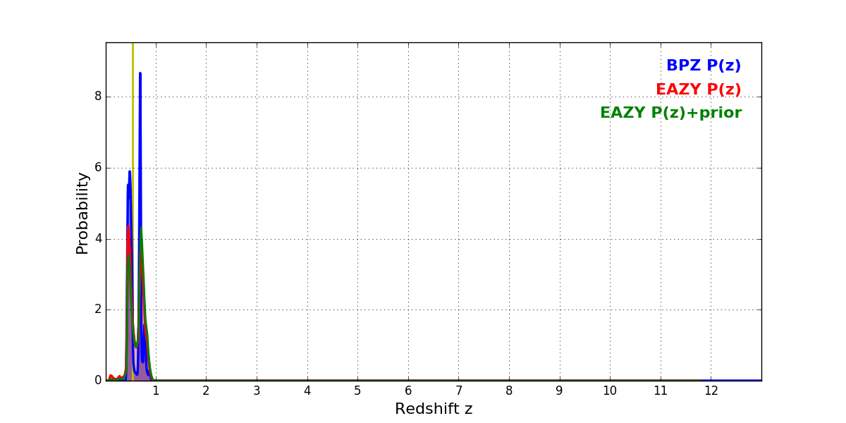 In P(z) plots: Yellow lines mark the cluster redshift z = 0.546,