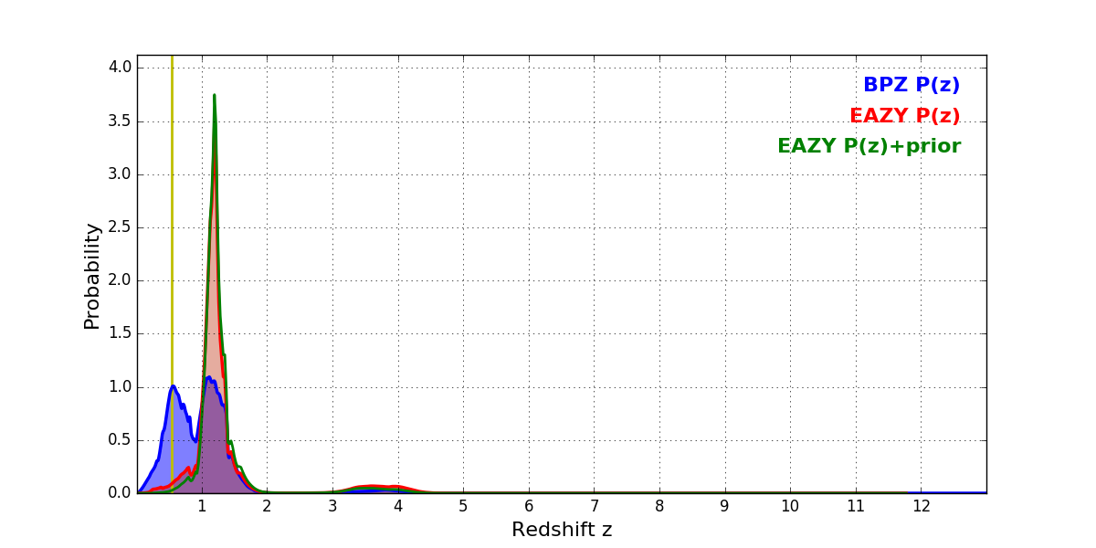 In P(z) plots: Yellow lines mark the cluster redshift z = 0.546,