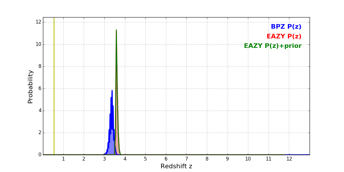 In P(z) plots: Yellow lines mark the cluster redshift z = 0.546,