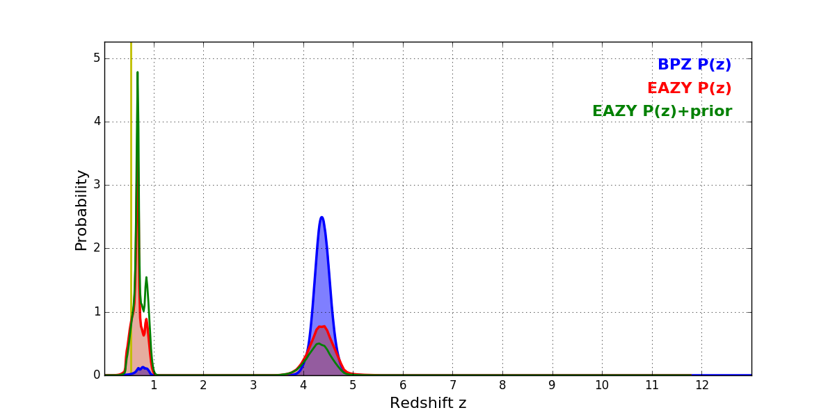 In P(z) plots: Yellow lines mark the cluster redshift z = 0.546,