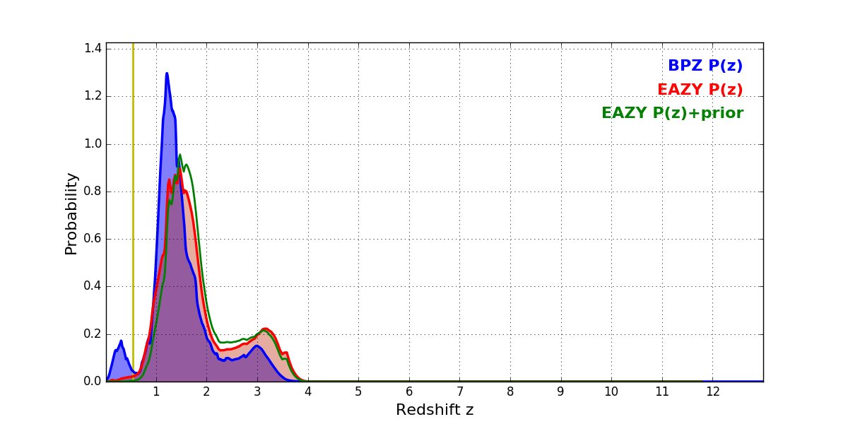 In P(z) plots: Yellow lines mark the cluster redshift z = 0.546,