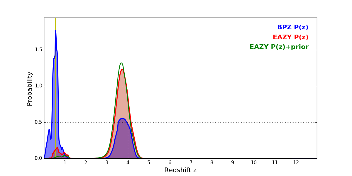 In P(z) plots: Yellow lines mark the cluster redshift z = 0.546,