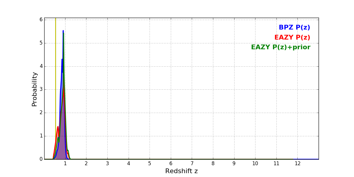 In P(z) plots: Yellow lines mark the cluster redshift z = 0.546,