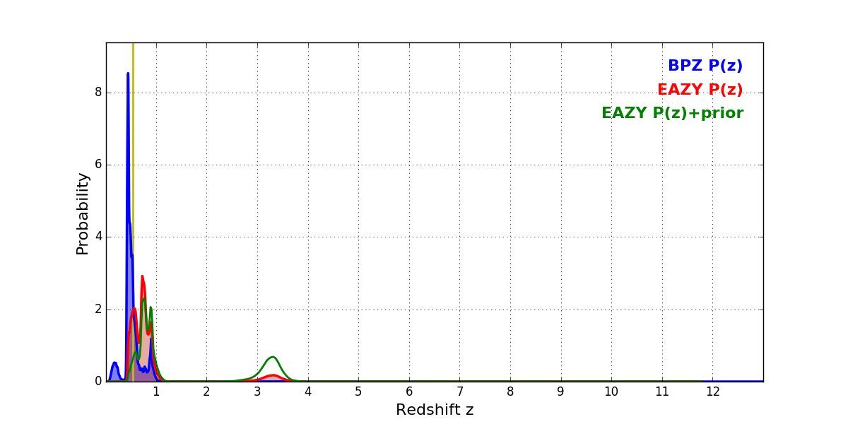 In P(z) plots: Yellow lines mark the cluster redshift z = 0.546,