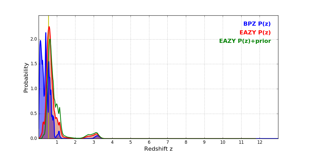 In P(z) plots: Yellow lines mark the cluster redshift z = 0.546,