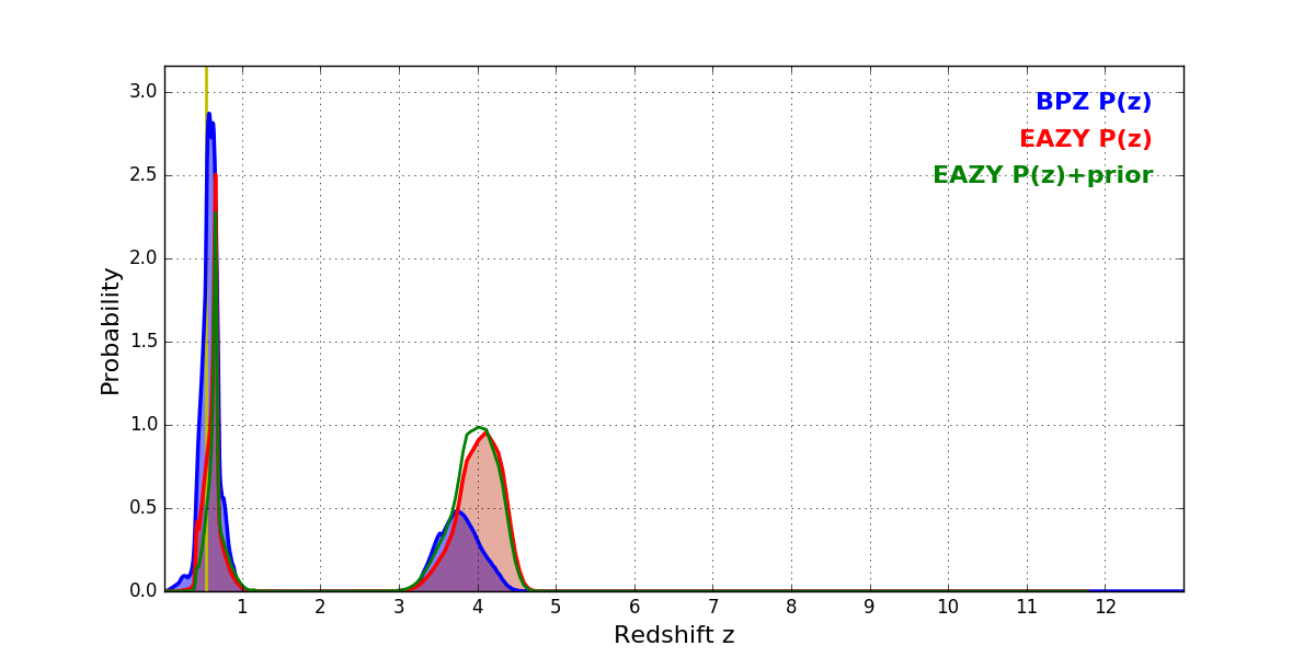 In P(z) plots: Yellow lines mark the cluster redshift z = 0.546,
