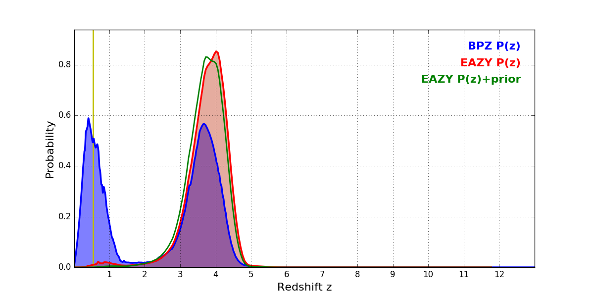 In P(z) plots: Yellow lines mark the cluster redshift z = 0.546,