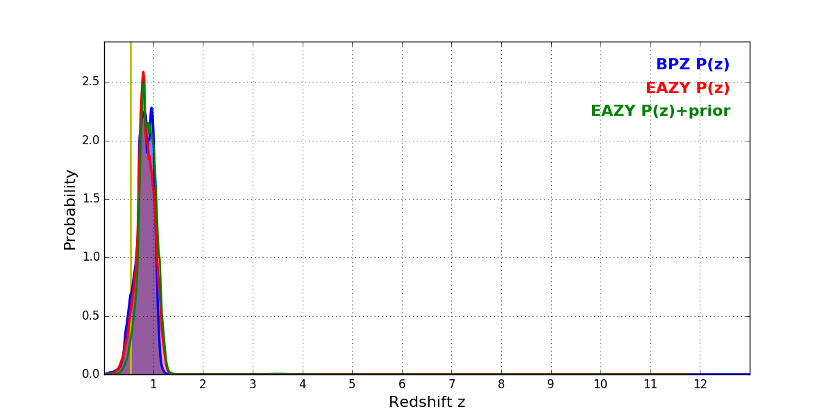 In P(z) plots: Yellow lines mark the cluster redshift z = 0.546,