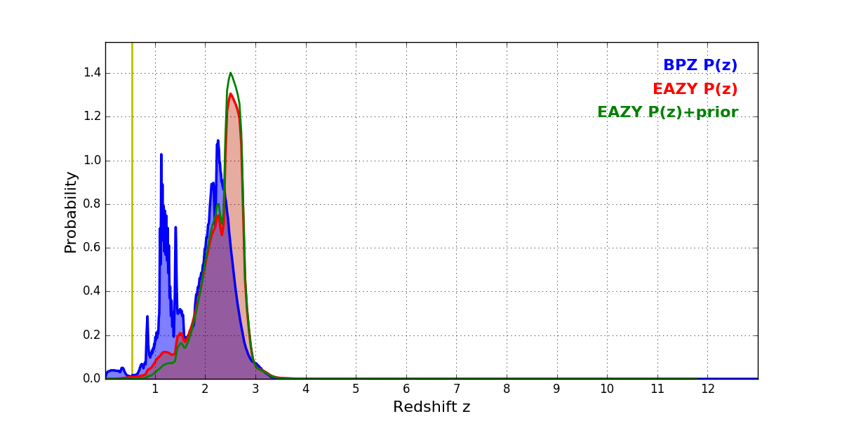 In P(z) plots: Yellow lines mark the cluster redshift z = 0.546,