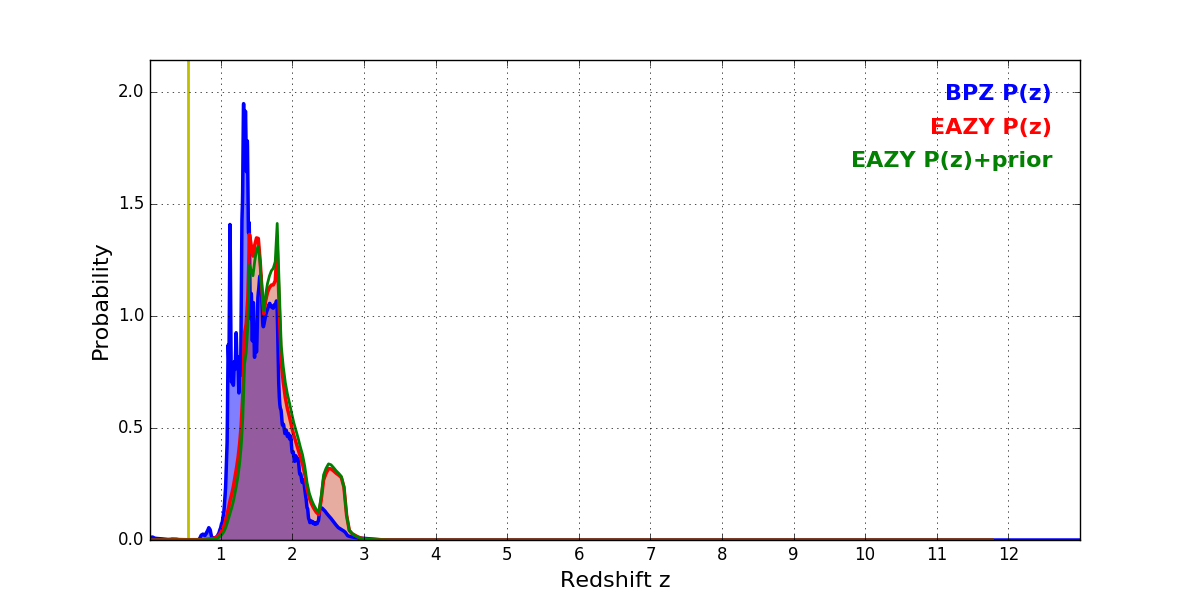 In P(z) plots: Yellow lines mark the cluster redshift z = 0.546,