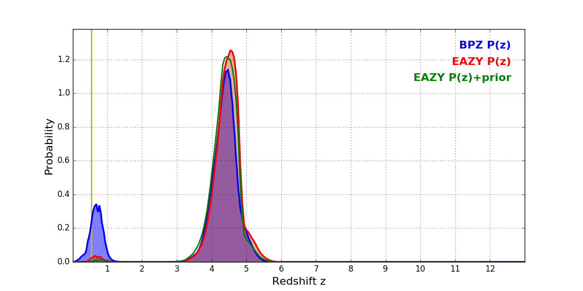In P(z) plots: Yellow lines mark the cluster redshift z = 0.546,