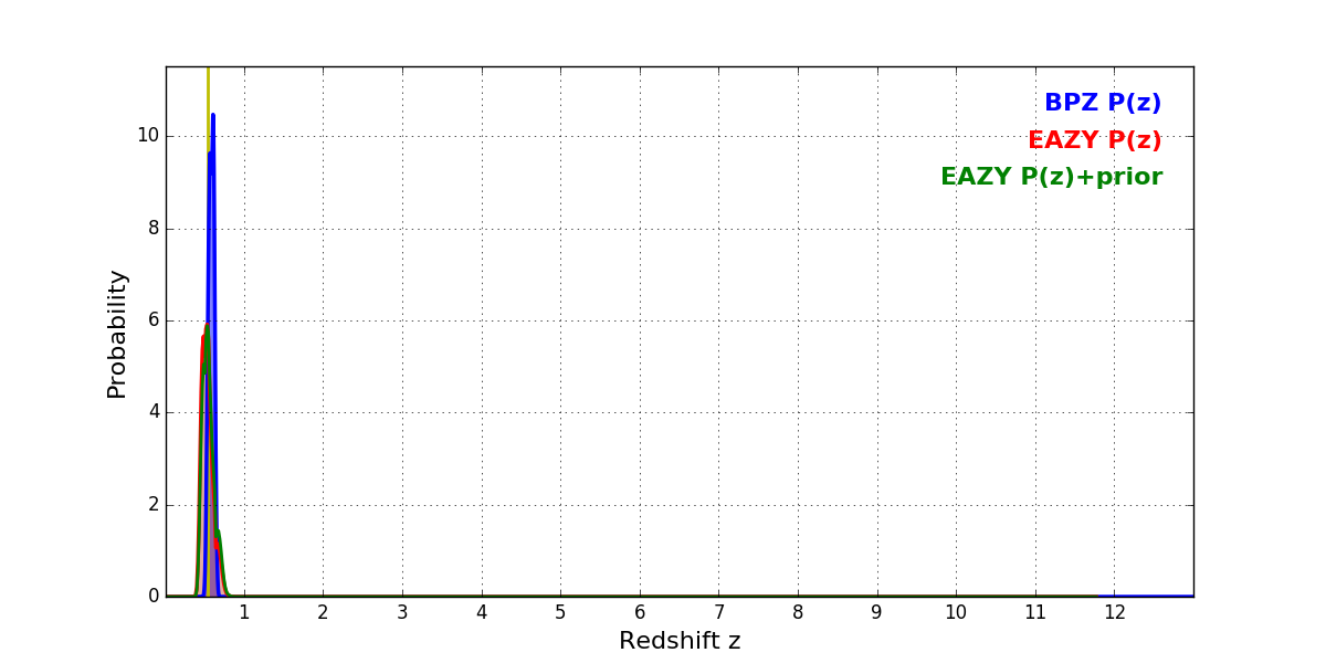 In P(z) plots: Yellow lines mark the cluster redshift z = 0.546,