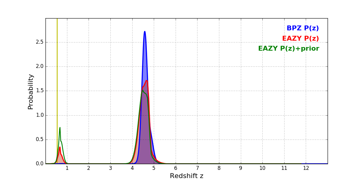 In P(z) plots: Yellow lines mark the cluster redshift z = 0.546,