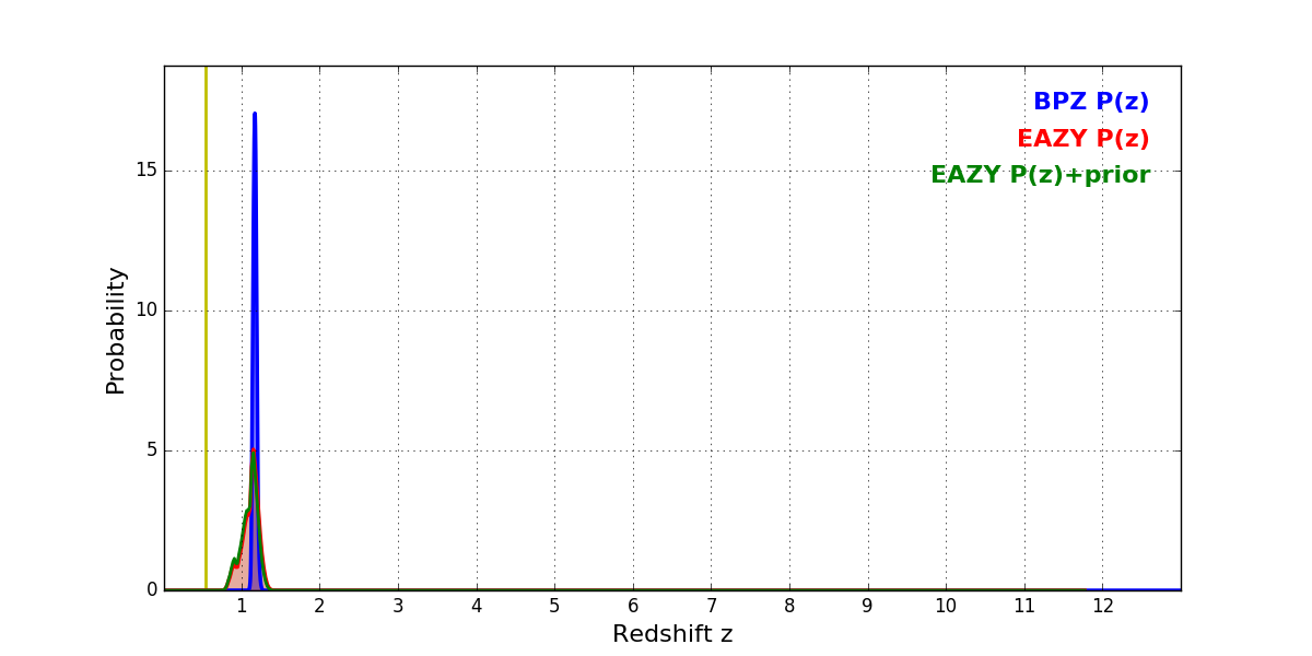 In P(z) plots: Yellow lines mark the cluster redshift z = 0.546,