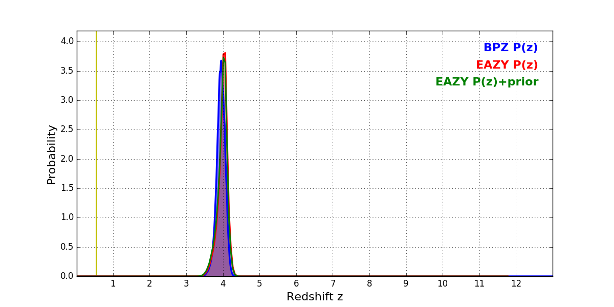 In P(z) plots: Yellow lines mark the cluster redshift z = 0.546,