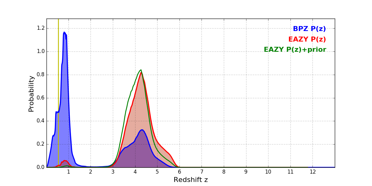 In P(z) plots: Yellow lines mark the cluster redshift z = 0.546,