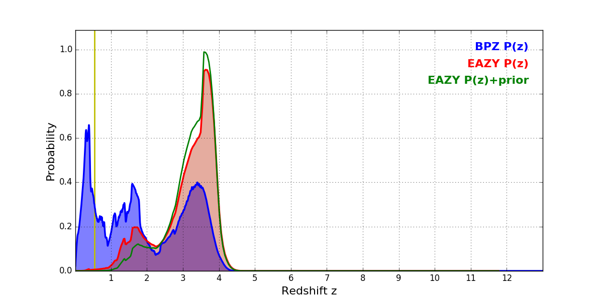 In P(z) plots: Yellow lines mark the cluster redshift z = 0.546,