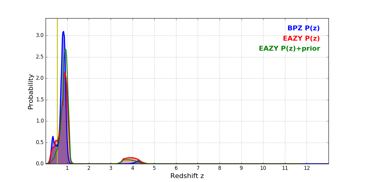 In P(z) plots: Yellow lines mark the cluster redshift z = 0.546,