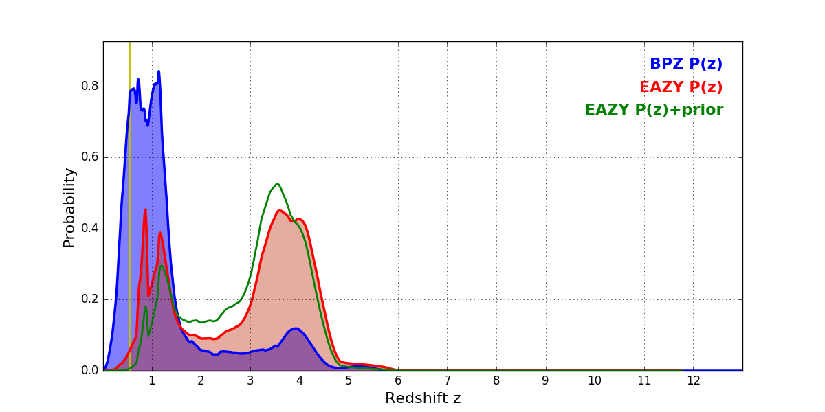 In P(z) plots: Yellow lines mark the cluster redshift z = 0.546,