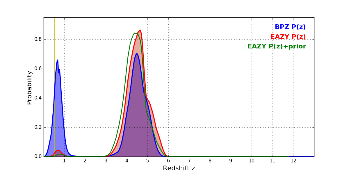 In P(z) plots: Yellow lines mark the cluster redshift z = 0.546,