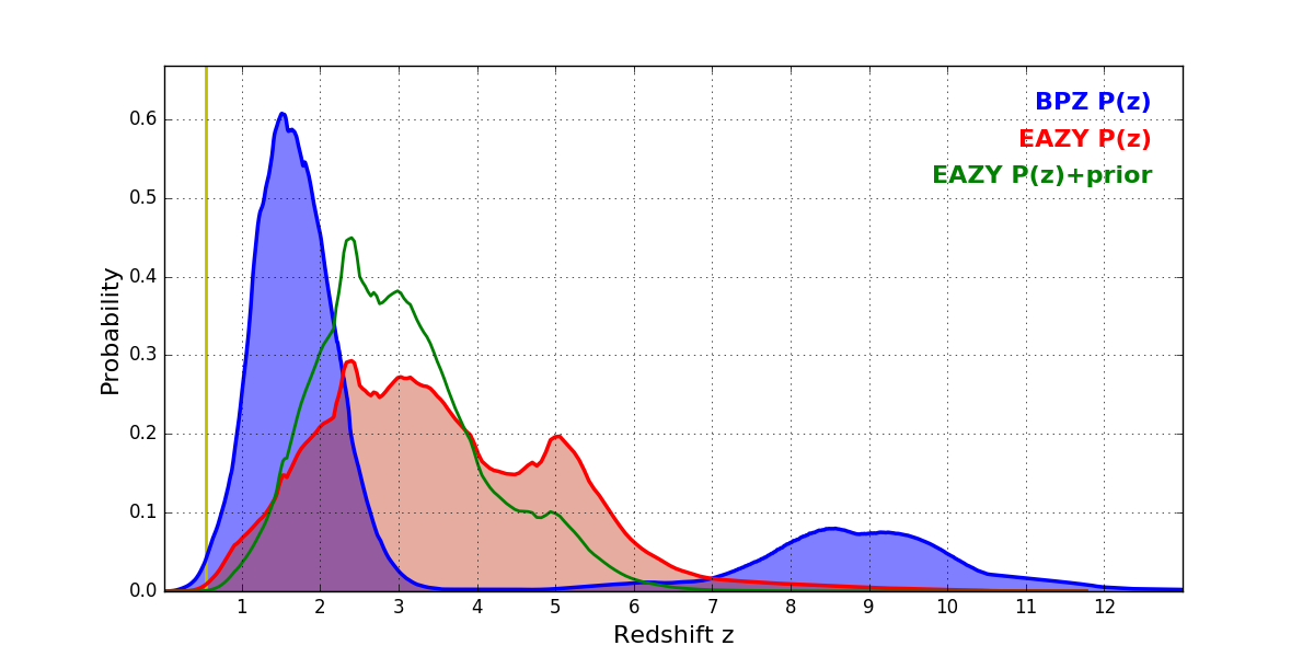 In P(z) plots: Yellow lines mark the cluster redshift z = 0.546,