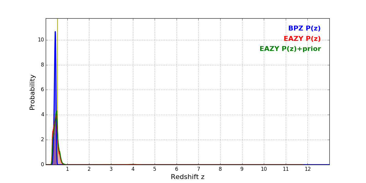 In P(z) plots: Yellow lines mark the cluster redshift z = 0.546,
