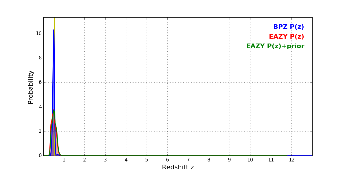 In P(z) plots: Yellow lines mark the cluster redshift z = 0.546,