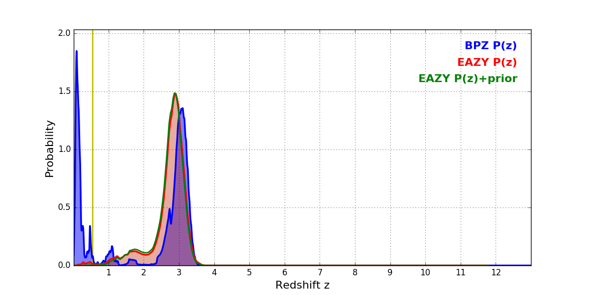 In P(z) plots: Yellow lines mark the cluster redshift z = 0.546,