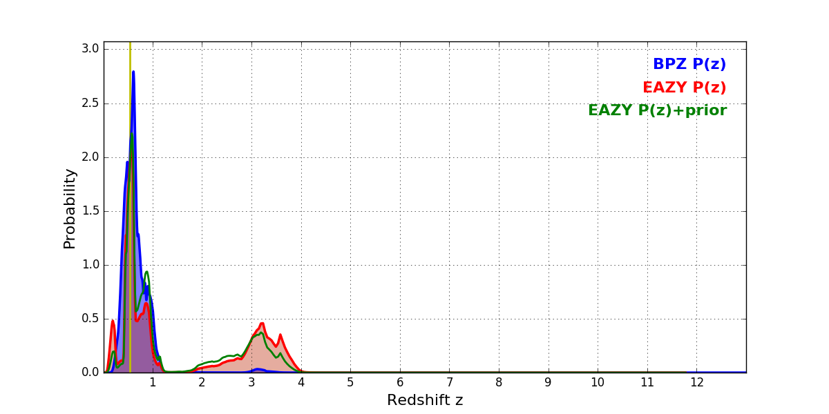 In P(z) plots: Yellow lines mark the cluster redshift z = 0.546,