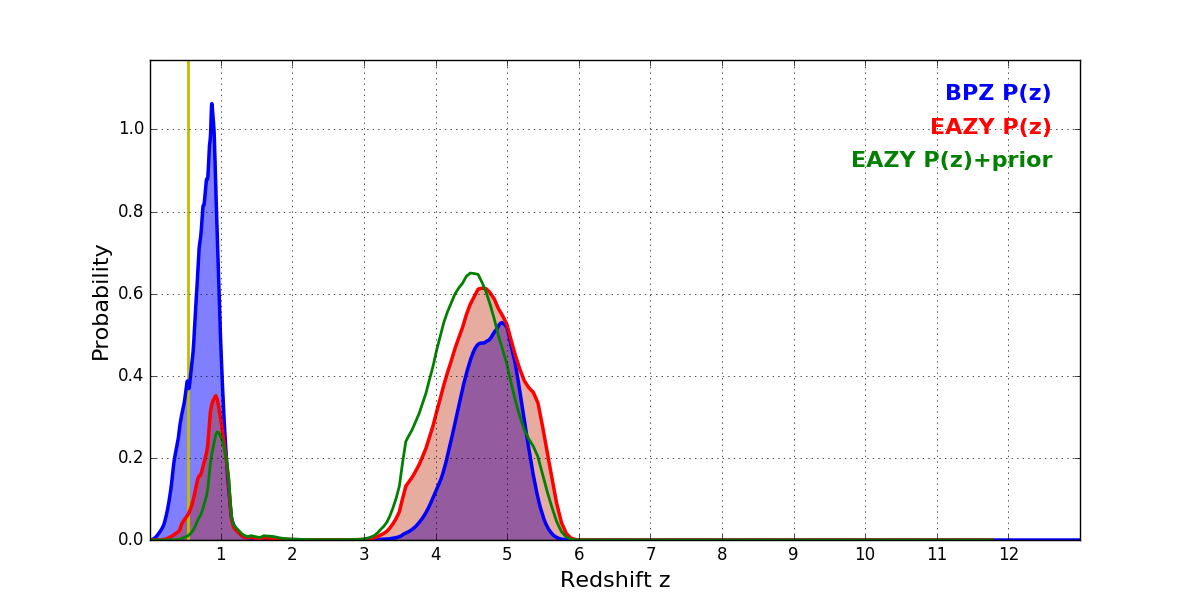 In P(z) plots: Yellow lines mark the cluster redshift z = 0.546,