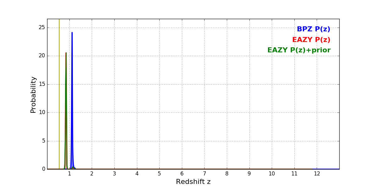 In P(z) plots: Yellow lines mark the cluster redshift z = 0.546,