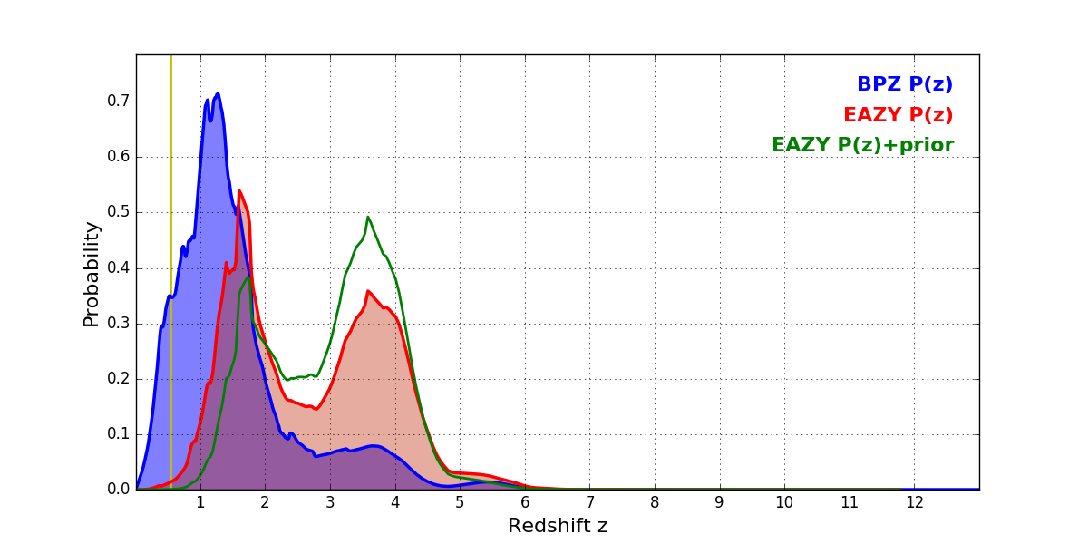 In P(z) plots: Yellow lines mark the cluster redshift z = 0.546,