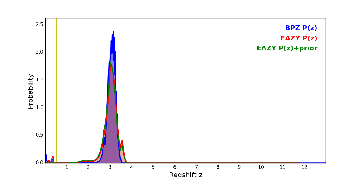 In P(z) plots: Yellow lines mark the cluster redshift z = 0.546,