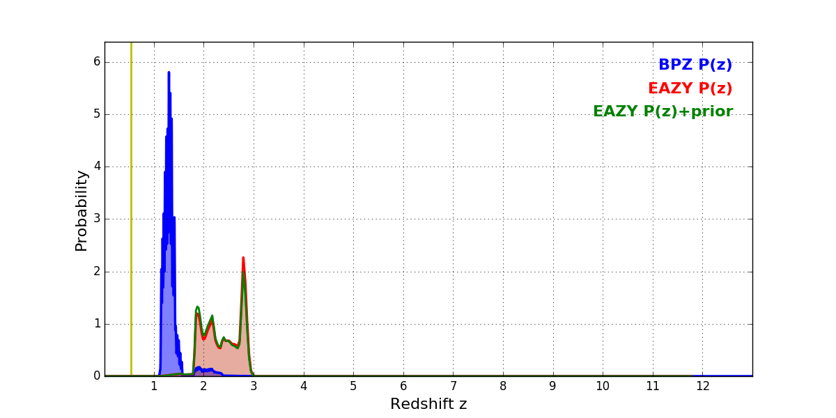 In P(z) plots: Yellow lines mark the cluster redshift z = 0.546,