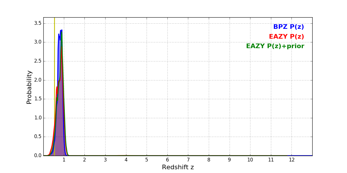 In P(z) plots: Yellow lines mark the cluster redshift z = 0.546,