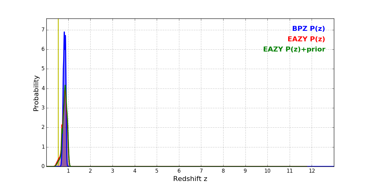 In P(z) plots: Yellow lines mark the cluster redshift z = 0.546,